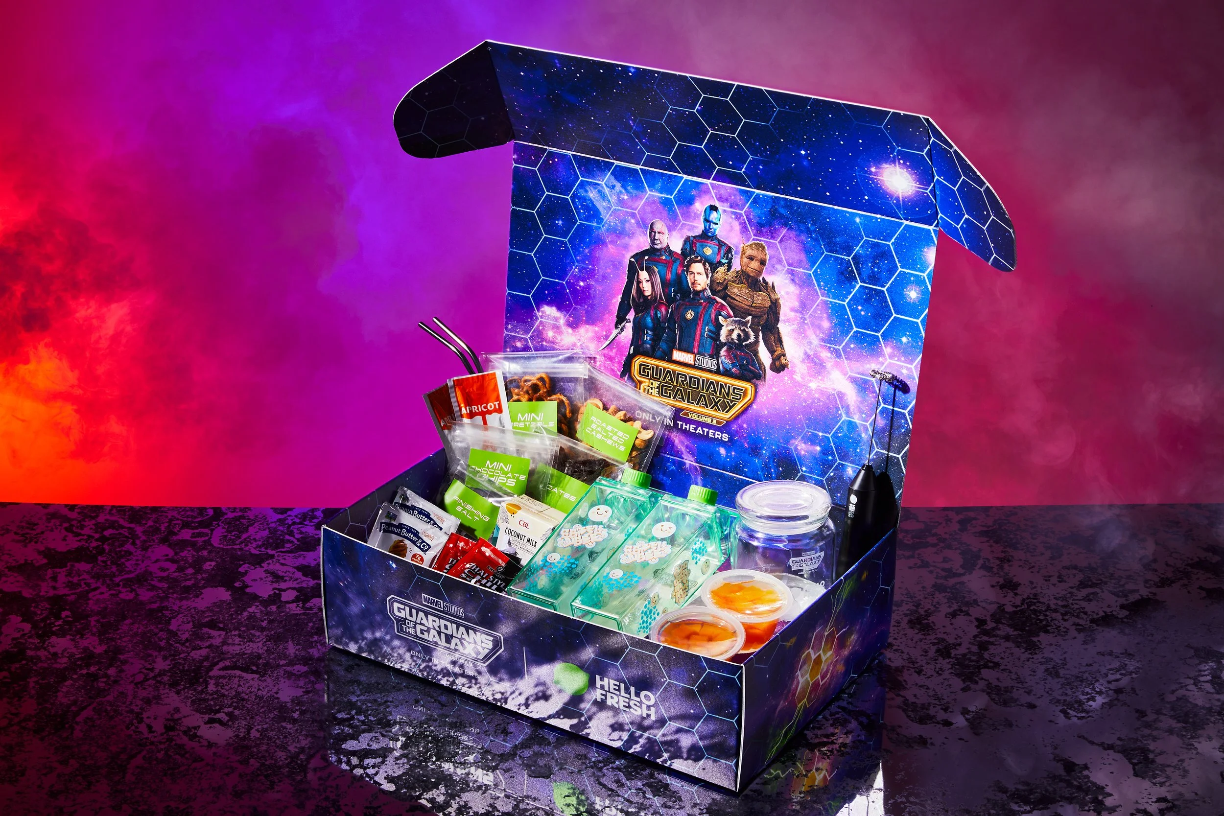 For Marvel's Guardians of the Galaxy Vol. 3 theatrical release in May 2023, HelloFresh created authentic space-worthy snacks directly from the Marvel universe. The partnership featured Zarg Nut Bites (the crunchy snacks Drax famously munches throughout the films) and Mango Milky Fizz (making its debut in Vol. 3). We also created custom container for both of these snacks that came in the kit, as well as a series of themed recipes that appeared on the HelloFresh menu.
