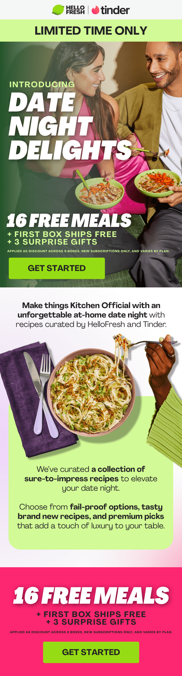 In November 2023, HelloFresh and Tinder launched "Forking Season," a clever play on "cuffing season" that capitalized on a key insight: 81% of Americans view cooking a meal for their partner as signaling a relationship moving from casual to committed.